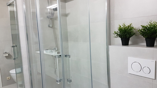 Badkamer met douche, wastafel, spiegelkastje, toilet,